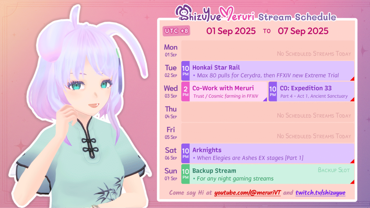 There are lesser streams this week (and probably the next two as well) as I have to focus on one of my projects. I’m still doing the fixed streams, with CO: Expedition 33 on Wednesday and Arknights on Saturday.